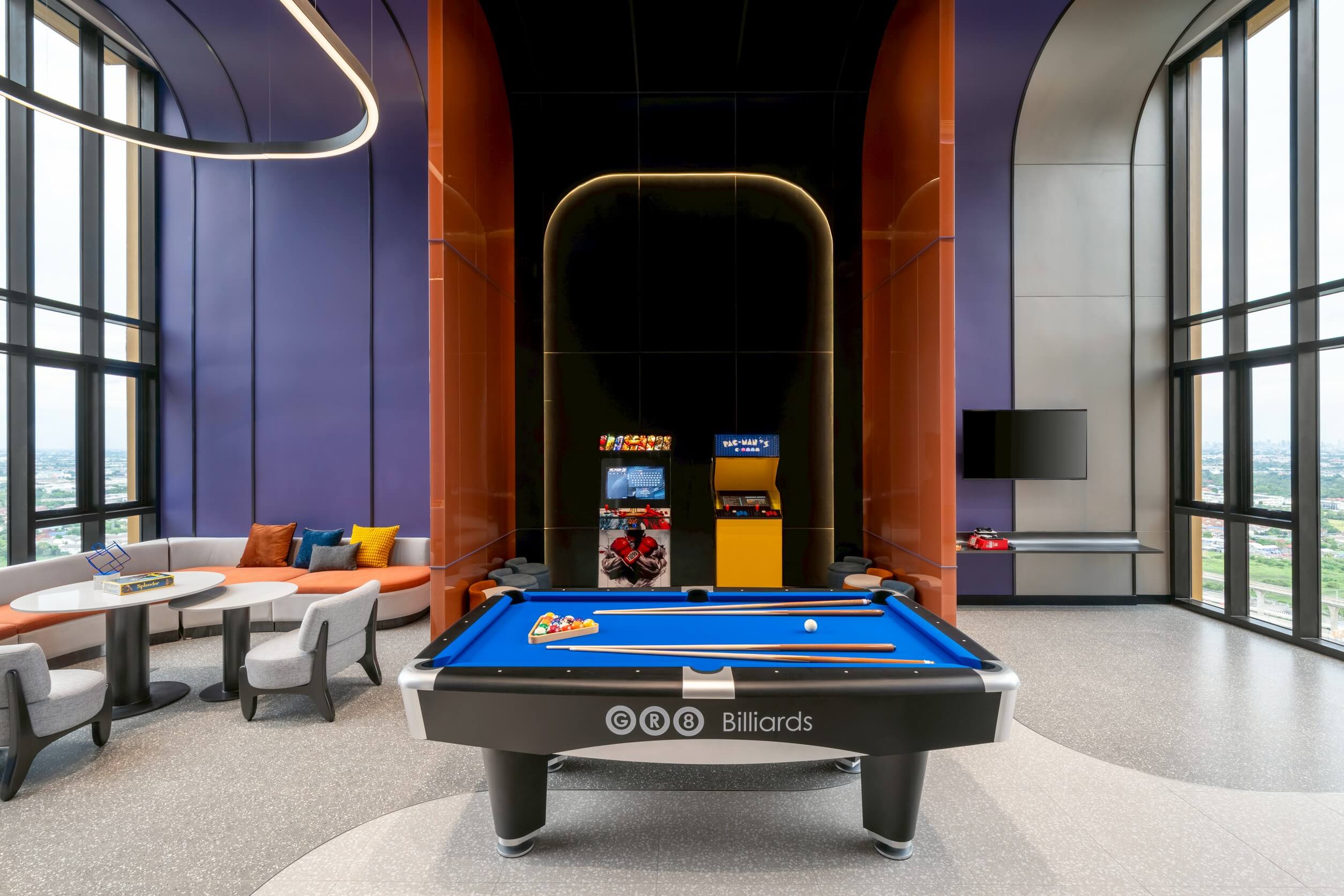 จุดขายหลักของโครงการคือ “ส่วนกลางจัดเต็ม” เช่น พื้นที่ Co-Working & Co-Kitchen, ฟิตเนสวิวสวน, สระว่ายน้ำยาว, Game & Play Zone และลานพักผ่อนกลางแจ้งที่มีบรรยากาศรีสอร์ต พร้อมดีไซน์ห้องพักที่เพดานสูง 2.8 เมตร ให้ความรู้สึกโปร่งโล่งเกินราคาตลาด
