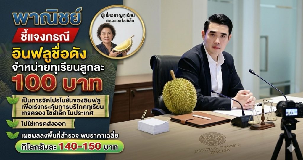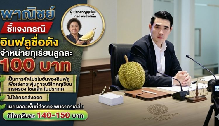กระทรวงพาณิชย์ออกโรงชี้แจงกรณีอินฟลูเอนเซอร์จำหน่ายทุเรียนในราคาลูกละ 100 บาท ย้ำเป็นเพียงการจัดโปรโมชันเพื่อกระตุ้นการบริโภค “ทุเรียนเกรดรอง–ไซซ์เล็ก” ภายในประเทศ ไม่ใช่สินค้าคุณภาพส่งออก พร้อมเผยผลสำรวจล่าสุดพบราคาตลาดเฉลี่ยยังอยู่ที่ 140–150 บาทต่อกิโลกรัม สะท้อนกลไกราคาในช่วงผลผลิตออกสู่ตลาดจำนวนมาก