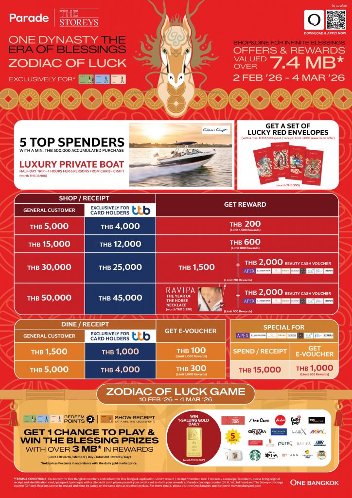 วัน แบงค็อก รีเทล (One Bangkok Retail) จัดกิจกรรมเฉลิมฉลองเทศกาลตรุษจีนภายใต้ธีม “One Dynasty: The Era of Blessing” พร้อมเปิดแคมเปญส่งเสริมการใช้จ่ายร่วมกับบัตรเครดิต ttb ในชื่อ “ZODIAC OF LUCK” เพื่อกระตุ้นทราฟฟิกผู้ใช้บริการและยอดใช้จ่ายในศูนย์การค้า ตั้งแต่วันนี้ถึง 4 มีนาคม 2569
