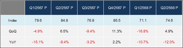 หากเศรษฐกิจชะลอตัวแรงจากปัจจัยภายนอก เช่น มาตรการภาษีสหรัฐฯ ที่กระทบรายได้แรงงานไทย ปัญหาสินเชื่อที่เข้มงวด และความเสี่ยงสภาพคล่องของผู้ประกอบการ ดัชนีอาจลดลงเหลือเพียง 71.2 จุด หรือหดตัวร้อยละ 12.9