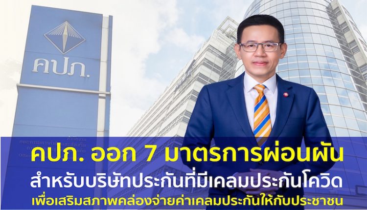 คปภ. ออก 7 มาตรการผ่อนผัน สำหรับบริษัทประกันที่มีเคลมประกันโควิด เพื่อเสริมสภาพคล่องจ่ายค่า เคลมประกันให้กับประชาชน เป็นการสร้างความยืดหยุ่นในการดำเนินธุรกิจให้กับบริษัทประกันภัย ด้วยการลดภาระด้านการดำรงเงินกองทุนของบริษัทประกันภัยในช่วงสถานการณ์การแพร่ระบาดของCOVID-19