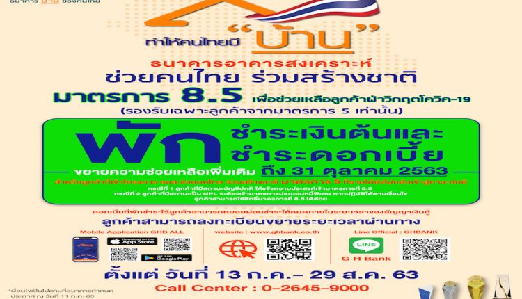 ทั้งนี้เพื่อเป็นการบรรเทาผลกระทบเพิ่มเติมให้กับลูกค้าที่เข้ามาตรการที่ 5 ซึ่งได้ยอมรับข้อตกลงของมาตรการไปแล้ว หากรายได้ยังไม่กลับเข้าสู่ภาวะปกติหรือไม่มีความสามารถที่จะกลับมาผ่อนชำระหนี้ได้ตามปกติ ธอส.จึงได้เปิดให้แจ้งความประสงค์เข้า มาตรการที่ 8.5 พักชำระเงินต้นและพักชำระดอกเบี้ย ผ่าน Application : GHB ALL ได้ตั้งแต่วันที่ 13 กรกฎาคม – 29 สิงหาคม 2563 แบ่งเป็น