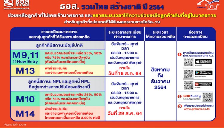 ทั้งนี้ มาตรการที่ 9, 11, 11 New Entry และ 13 ธนาคารขยายระยะเวลาให้ลงทะเบียนแจ้งความประสงค์ได้ถึงวันที่16 สิงหาคม 2564 สำหรับมาตรการที่ 10และ 14 จะขยายถึงวันที่ 29 สิงหาคม 2564 โดยทุกมาตร การข้างต้นจะได้รับความช่วยเหลือไปจนถึงวันที่31 ธันวาคม 2564 และภายในเดือนตุลาคม 2564ธนาคารจะทำการสำรวจความประสงค์ของลูกค้าอีกครั้งว่าต้องการรับความช่วยเหลือต่อไปจนถึงวันที่31 ธันวาคม 2564 หรือไม่ และสำหรับลูกค้าที่มีความประสงค์เข้ามาตรการจะต้อง Upload หลักฐานยืนยันว่าได้รับผล กระทบทางรายได้ผ่านทาง Application:GHB ALL และ GHB Buddy ให้ธนาคารพิจารณา โดยสามารถลงทะเบียนแจ้งความประสงค์ผ่าน Application:GHB ALL หรือ GHB Buddy บน Application Line ได้ในวันจันทร์ – ศุกร์ เวลา 8.30-15.00 น. เว้นวันหยุดราชการและวันหยุดนักขัตฤกษ์ ส่วนกรณีที่ลูกค้าไม่มีสมาร์ทโฟนสามารถกรอกข้อมูลเพื่อแจ้งความประสงค์ขอรับความช่วยเหลือตามมาตรการได้ที่www.ghbank.co.th
