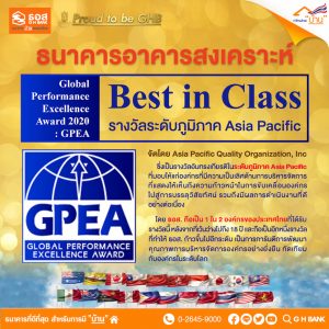 Asia Pacific Quality Organization, Inc(APQO) ประกาศให้ ธนาคารอาคารสงเคราะห์(ธอส.) ได้รับรางวัล Global Performance Excellence Award 2020 : GPEA ระดับ Best in Class ซึ่งเป็นรางวัลอันทรงเกียรติด้านการบริหารจัดการที่ได้รับการยอมรับในระดับสากลในระดับภูมิภาค Asia Pacific ที่มอบให้แก่องค์กรที่มีความเป็นเลิศด้านการบริหารจัดการที่แสดงให้เห็นถึงความก้าวหน้าในการขับเคลื่อนองค์กรไปสู่การบรรลุวิสัยทัศน์ รวมถึงมีผลการดำเนินงานที่ดีอย่างต่อเนื่อง โดย ธอส. ถือเป็น 1 ใน 2 องค์กรของประเทศไทยที่ได้รับรางวัลนี้หลังจากที่เว้นว่างไปถึง 18 ปี และเป็นอีกหนึ่งรางวัลที่ทำให้ ธอส. ก้าวขึ้นไปอีกระดับของการพัฒนาคุณภาพด้านการบริหารจัดการองค์กรอย่างยั่งยืนและสะท้อนให้เห็นว่ากระบวนการทำงานและผลการดำเนินงานของ ธอส. ทัดเทียมกับองค์กรระดับโลก ทั้งนี้ Asia Pacific Quality Organization, Inc(APQO) เป็นองค์กรระดับโลก ที่ทำหน้าที่รวบรวมสมาคมวิชาชีพ กลุ่มธุรกิจชั้นนำที่มีคุณภาพในภูมิภาคเอเชียแปซิฟิก เพื่อคัดเลือกองค์กรที่มีความเป็นเลิศในด้านต่างๆ ให้ได้รับรางวัล เพื่อให้เป็นมาตรฐานที่จะส่งผลต่อการเติบโตทางเศรษฐกิจ และธุรกิจของแต่ละประเทศ หรือภูมิภาคให้ดีขึ้น