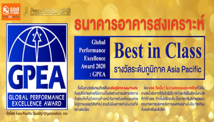 Asia Pacific Quality Organization, Inc(APQO) ประกาศให้ ธนาคารอาคารสงเคราะห์(ธอส.) ได้รับรางวัล Global Performance Excellence Award 2020 : GPEA ระดับ Best in Class ซึ่งเป็นรางวัลอันทรงเกียรติด้านการบริหารจัดการที่ได้รับการยอมรับในระดับสากลในระดับภูมิภาค Asia Pacific ที่มอบให้แก่องค์กรที่มีความเป็นเลิศด้านการบริหารจัดการที่แสดงให้เห็นถึงความก้าวหน้าในการขับเคลื่อนองค์กรไปสู่การบรรลุวิสัยทัศน์ รวมถึงมีผลการดำเนินงานที่ดีอย่างต่อเนื่อง โดย ธอส. ถือเป็น 1 ใน 2 องค์กรของประเทศไทยที่ได้รับรางวัลนี้หลังจากที่เว้นว่างไปถึง 18 ปี และเป็นอีกหนึ่งรางวัลที่ทำให้ ธอส. ก้าวขึ้นไปอีกระดับของการพัฒนาคุณภาพด้านการบริหารจัดการองค์กรอย่างยั่งยืนและสะท้อนให้เห็นว่ากระบวนการทำงานและผลการดำเนินงานของ ธอส. ทัดเทียมกับองค์กรระดับโลก ทั้งนี้ Asia Pacific Quality Organization, Inc(APQO) เป็นองค์กรระดับโลก ที่ทำหน้าที่รวบรวมสมาคมวิชาชีพ กลุ่มธุรกิจชั้นนำที่มีคุณภาพในภูมิภาคเอเชียแปซิฟิก เพื่อคัดเลือกองค์กรที่มีความเป็นเลิศในด้านต่างๆ ให้ได้รับรางวัล เพื่อให้เป็นมาตรฐานที่จะส่งผลต่อการเติบโตทางเศรษฐกิจ และธุรกิจของแต่ละประเทศ หรือภูมิภาคให้ดีขึ้น