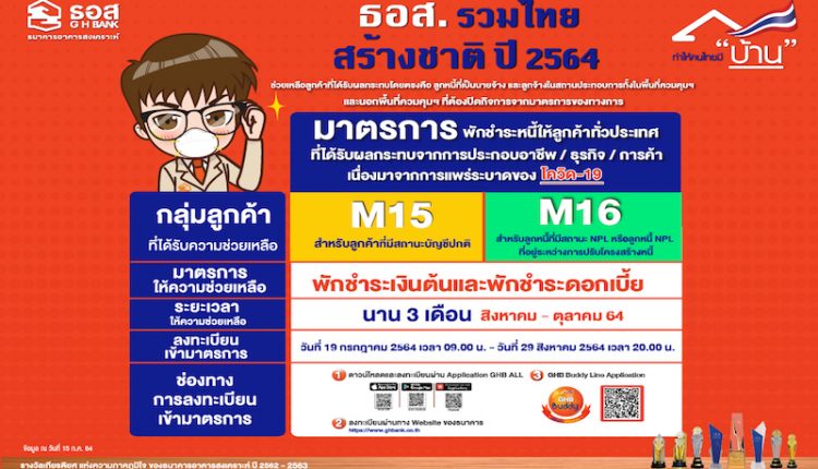 ธอส. ขานรับนโยบายกระทรวงการคลังและธนาคารแห่งประเทศไทย ออก 2 มาตรการเร่งด่วน ช่วยลูกค้าที่ยังคงได้รับผลกระทบด้านรายได้จาก COVID-19 เป็นระยะเวลานาน 3 เดือน ตั้งแต่สิงหาคม-ตุลาคม 2564 ประกอบด้วย มาตรการที่ 15 พักชำระเงินต้นและพักชำระดอกเบี้ย สำหรับลูกค้าที่มีสถานะบัญชีปกติ และ มาตรการที่ 16 พักชำระเงินต้นและพักชำระดอกเบี้ย สำหรับลูกหนี้ที่มีสถานะ NPL (ค้างชำระเงินงวดติดต่อกันมากกว่า 3 เดือน) หรืออยู่ระหว่างการปรับโครงสร้างหนี้ ลงทะเบียนผ่าน Application : GHB ALL หรือ GHB Buddy บน Application Line ได้ตั้งแต่วันที่ 19 กรกฎาคม – 29 สิงหาคม 2564