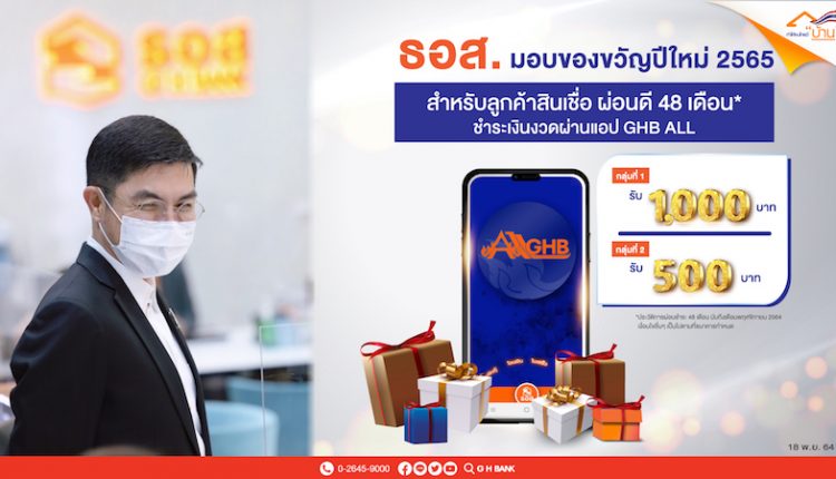 ธอส.มอบของขวัญปีใหม่สำหรับลูกค้าสินเชื่อบ้านที่มีวินัยการผ่อนชำระเงินงวดสินเชื่อบ้านสม่ำเสมอย้อนหลัง 48เดือน (นับถึงงวดเดือนพฤศจิกายน 2564) โดยแบ่งลูกค้าเป็น 2 กลุ่ม ประกอบด้วย กลุ่มที่ 1 ได้รับเงิน 1,000 บาท สำหรับลูกค้าที่มีคุณสมบัติและปฏิบัติได้ตามเงื่อนไข เช่น วงเงินกู้ทุกบัญชีภายใต้หลักประกันเดียวกันรวมไม่เกิน 2 ล้านบาท มีสถานะบัญชีปกติ และชำระเงินงวดผ่าน Application:GHB ALL ในงวดชำระเดือนพฤศจิกายน – งวดชำระเดือนธันวาคม 2564 และกลุ่มที่ 2 ได้รับเงิน 500 บาท สำหรับลูกค้าที่ไม่ได้รับสิทธิ์ในกลุ่มที่ 1 และมีสถานะบัญชีปกติ ชำระเงินงวดผ่าน Application : GHB ALL ในงวดชำระเดือนธันวาคม 2564 หรืองวดชำระเดือนมกราคม 2565