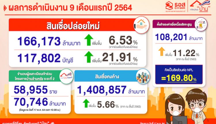 ธอส. เปิดผลการดำเนินงานในช่วง 9 เดือนแรกของปี 2564 ปล่อยสินเชื่อใหม่ได้166,173 ล้านบาท 117,802 บัญชี เพิ่มขึ้น 6.53% จากช่วงเดียวกันของปี 2563 สินเชื่อคงค้างรวม 1,408,857 ล้านบาท สินทรัพย์รวม 1,455,358ล้านบาท มีหนี้ที่ไม่ก่อให้เกิดรายได้ (NPL) 4.52% และมีเงินสำรองจำนวน 108,201 ล้านบาท คิดเป็นสัดส่วนต่อ NPL สูงถึง 169.80% ขณะที่ผู้ลงทะเบียนโครงการบ้านล้านหลังระยะที่2 ล่าสุด ณ วันที่ 17 ตุลาคม 2564อยู่ที่ 58,955 ราย คิดเป็นวงเงินสินเชื่อ 70,746ล้านบาท พร้อมช่วยเหลือลูกค้าที่ได้รับผลกระทบจาก COVID-19 อย่างต่อเนื่อง โดยนับตั้งแต่ปี 2563 ถึงปัจจุบันเป็นระยะเวลา21 เดือน มีจำนวนลูกค้าเข้ามาตรการช่วยเหลือของ ธอส. รวมสูงสุดถึง 968,555 บัญชี เงินต้นคงเหลือ 842,056ล้านบาท