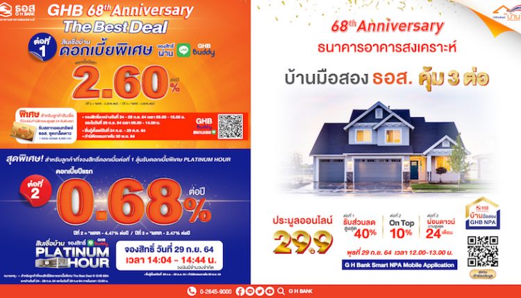 ธนาคารอาคารสงเคราะห์ จัดโปรโมชั่น GH Bank 68th Anniversary ด้วย 2 ช่วงเวลาพิเศษในวันที่ 29 กันยายน 2564 เริ่มด้วย เวลา 12.00-13.00 น. ประมูลบ้านมือสองออนไลน์ผ่าน Mobile Application : G H Bank Smart NPA นำทรัพย์ดี 299 รายการ พร้อมด้วยโปรโมชั่นพิเศษ ราคาเริ่มต้นประมูลให้ส่วนลดพิเศษสูงสุด 40% จากราคาปกติ โอนกรรมสิทธิ์ภายในวันที่ 30 พฤศจิกายน 2564 รับส่วนลด on top เพิ่มอีก 10% และผ่อนดาวน์ดอกเบี้ย 0% นานสูงสุด 2 ปี หรือ 24 เดือน ทั้งนี้ ลูกค้าที่ชนะการประมูล โดยเสนอราคา 9 ลำดับแรก และทำสัญญาจะซื้อจะขายตามระยะเวลาที่ธนาคารกำหนด จะได้รับเครื่องฟอกอากาศ มูลค่ากว่า 5,000 บาท และ เวลา 14.04 – 14.44 น. Platinum Hour อัตราดอกเบี้ยปีที่ 1 เท่ากับ 0.68% ต่อปี ปีที่ 2 อัตราดอกเบี้ย MRR-4.47% ต่อปี (ปัจจุบันเท่ากับ 1.68% ต่อปี) ปีที่ 3 อัตราดอกเบี้ย MRR-2.47% ต่อปี(ปัจจุบันเท่ากับ 3.68% ต่อปี) เฉลี่ยอัตราดอกเบี้ย 3 ปีแรก เพียง 2.01% (ปัจจุบันอัตราดอกเบี้ย MRR ธอส.เท่ากับ 6.150% ต่อปี) จองสิทธิ์ผ่าน Line GHB Buddy โดยจะต้องจองสิทธิ์วงเงินสินเชื่อ The Best Deal อัตราดอกเบี้ยปีที่ 1 เท่ากับ 2.60% ต่อปี มาก่อนแล้ว และปิดจองทันทีเมื่อมีการจองเต็มกรอบวงเงิน 500 ล้านบาท สอบถามรายละเอียดที่ศูนย์ลูกค้าสัมพันธ์(Call Center) โทร 0-2645-9000 หรือ Facebook Fanpage ธนาคารอาคารสงเคราะห์ หรือ ธอส. ทุกสาขาทั่วประเทศ และติดตามข้อมูลข่าวสารได้ที่ Application : GHB ALL และเว็บไซต์ www.ghbank.co.th