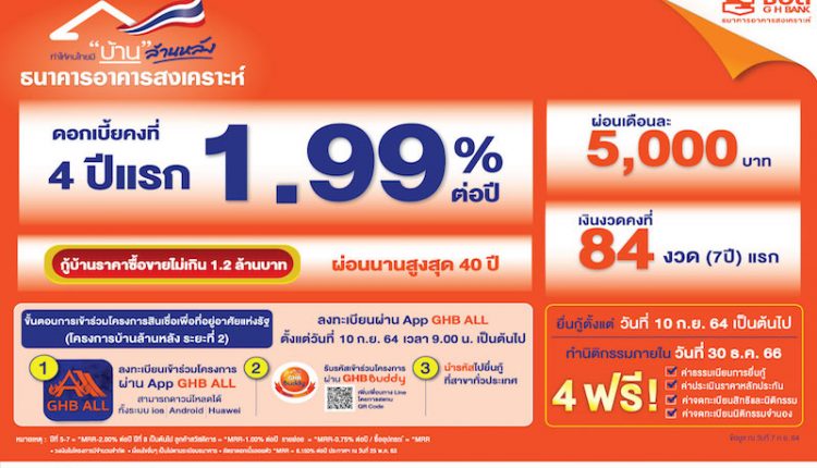 ที่ประชุมคณะรัฐมนตรีมีมติเห็นชอบให้ธนาคารอาคารสงเคราะห์(ธอส.) สานต่อ “โครงการสินเชื่อเพื่อที่อยู่อาศัยแห่งรัฐ (โครงการบ้านล้านหลัง ระยะที่ 2)” ภายใต้กรอบวงเงินรวม 20,000 ล้านบาท มุ่งเน้นกลุ่มผู้มีรายได้น้อย ผู้ที่เริ่มต้นทำงานสร้างครอบครัว และผู้สูงอายุ ได้มีที่อยู่อาศัยเป็นของตนเอง ดอกเบี้ยคงที่ 4 ปีแรก 1.99% ต่อปี ให้กู้ซื้อที่อยู่อาศัยราคาซื้อ-ขายไม่เกิน 1,200,000 บาท ทั้งบ้านใหม่ บ้านมือสอง และทรัพย์ NPA ของ ธอส. เงินงวดคงที่งวดละ 5,000 บาท นานถึง 84 งวดแรก (กรณีกู้ 1.2 ล้านบาท ผ่อนนานสูงสุด 40 ปี) ฟรี!! ค่าธรรมเนียม 4 ประเภท 1.ค่าธรรมเนียมการยื่นกู้ 2.ค่าประเมินราคาหลักประกัน 3.ค่าจดทะเบียนสิทธิและนิติกรรม และ 4.ค่าจดทะเบียนนิติกรรมจำนอง ลงทะเบียนผ่าน Mobile Application : GHB ALL เพื่อรับรหัสเข้าร่วมโครงการได้ตั้งแต่วันศุกร์ที่ 10 กันยายน 2564 เวลา 9.00 น. เป็นต้นไป