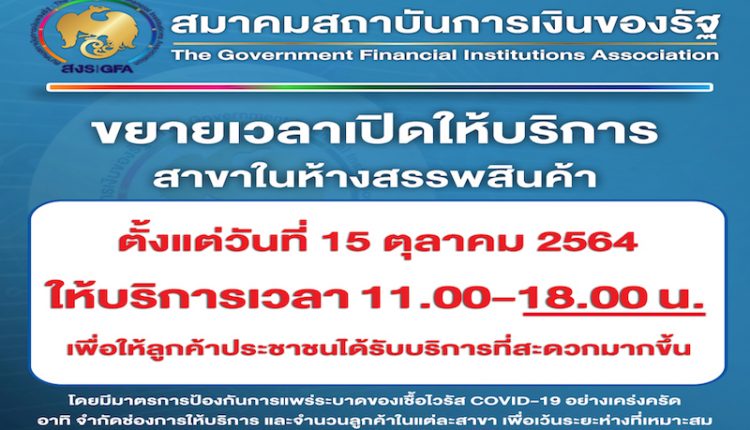 สมาคมสถาบันการเงินของรัฐ (สงร.) และสถาบันการเงินสมาชิก 4 แห่งที่มีสาขาให้บริการในห้างสรรพสินค้า ประกอบด้วย ธนาคารอาคารสงเคราะห์ (ธอส.) ธนาคารออมสิน ธนาคารเพื่อการเกษตรและสหกรณ์การเกษตร (ธ.ก.ส.) และ ธนาคารอิสลามแห่งประเทศไทย (ธอท.) พร้อมขยายเวลาการเปิดให้บริการสาขาของธนาคารในห้างสรรพสินค้า ศูนย์การค้า และคอมมูนิตี้มอลล์ จากเดิม เวลา 11.00– 17.00 น. มาเป็นเวลา 11.00– 18.00 น. ตั้งแต่วันศุกร์ที่ 15 ตุลาคม 2564 เป็นต้นไปซึ่งสอดคล้องกับที่ประชุมศูนย์บริหารสถานการณ์การแพร่ระบาดของโรคติดเชื้อไวรัสโคโรนา 2019 หรือ ศบค. ที่มีมติลดระยะเวลาห้ามออกนอกเคหสถาน (เคอร์ฟิว) ในช่วงเวลา 22.00-04.00 น. จากเดิมเริ่มตั้งแต่ 21.00 น. และให้ขยายเวลาเปิดห้างสรรพสินค้า ร้านอาหาร ร้านสะดวกซื้อ ตลาดสด ตลาดนัด ได้ถึง 21.00 น. จากเดิมให้ปิดก่อน 20.00 น. เพื่อให้ลูกค้าประชาชนได้รับบริการจากสถาบันการเงินของรัฐได้อย่างสะดวกมากขึ้น