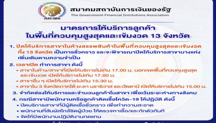 ตามที่ ราชกิจจานุเบกษา ได้เผยแพร่ข้อกำหนดออกตามความในมาตรา 9 แห่งพระราชกำหนดการบริหารราชการในสถานการณ์ฉุกเฉิน พ.ศ.2548 (ฉบับที่ 28) เพื่อกำหนดมาตรการที่จำเป็นและเร่งด่วน เพื่อลดการแพร่ระบาดของโรคโควิด-19 ในพื้นที่ 13 จังหวัด ประกอบด้วย กรุงเทพมหานคร ฉะเชิงเทรา ชลบุรี นครปฐม นนทบุรี นราธิวาส ปทุมธานี ปัตตานี พระนครศรีอยุธยา ยะลา สงขลา สมุทรปราการ และ สมุทรสาคร โดยกำหนดให้เป็นเขตพื้นที่ควบคุมสูงสุดและเข้มงวด และให้มีผลบังคับใช้วันที่ 20กรกฎาคม 2564 เป็นต้นไป นั้น สมาคมสถาบันการเงินของรัฐ (สงร.) และสถาบันการเงินสมาชิกทุกแห่ง ประกอบด้วย ธนาคารอาคารสงเคราะห์(ธอส.) ธนาคารออมสิน ธนาคารเพื่อการเกษตรและสหกรณ์การเกษตร (ธ.ก.ส.) ธนาคารเพื่อการส่งออกและนำเข้าแห่งประเทศไทย(ธสน.) ธนาคารพัฒนาวิสาหกิจขนาดกลางและขนาดย่อมแห่งประเทศไทย(ธพว.) ธนาคารอิสลามแห่งประเทศไทย(ธอท.) และบรรษัทประกันสินเชื่ออุตสาหกรรมขนาดย่อม (บสย.) จึงขอประกาศแนวทางในการให้บริการลูกค้าเพื่อให้สอดคล้องกับมาตรการของภาครัฐ ดังนี้