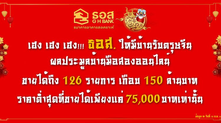 ธอส. เผยผลการประมูลขายทรัพย์ NPA หรือบ้านมือสองออนไลน์ ประจำเดือนกุมภาพันธ์ 2564 ผ่าน Application : G H Bank Smart NPA ครั้งนี้ มีลูกค้าแห่ซื้อทรัพย์ทั่วประเทศถึง 126รายการ มูลค่า 149.38 ล้านบาท แบ่งเป็น ทรัพย์ในพื้นที่กรุงเทพฯ และปริมณฑล 67 รายการ และทรัพย์ในส่วนภูมิภาค 59 รายการ ทรัพย์ที่ประมูลขายได้ในราคาถูกที่สุด คือ ห้องชุด บ้านสวนติวานนท์ เนื้อที่ 32.40ตารางเมตร อ.ปากเกร็ด จ.นนทบุรี ปิดประมูลในราคา 75,000 บาท เท่านั้น พิเศษ!!! ฉลองตรุษจีนให้ส่วนลดเพิ่มอีก 10% จากราคาที่ปิดประมูล เพียงทำสัญญาและทำนิติกรรมภายใน 30 เมษายน 2564