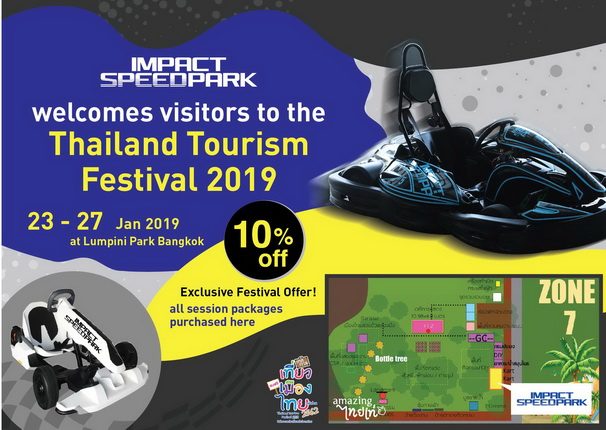 ตอบรับกระแสเที่ยวเมืองไทยคึกคัก อิมแพ็ค สปีด พาร์ค สนามโกคาร์ทมาตรฐานโลก ริมทะเลสาบเมืองทองธานี ภายใต้การบริหารของ บริษัท อิมแพ็ค เอ็กซิบิชั่น แมเนจเม้นท์ จำกัด หรือ ศูนย์แสดงสินค้าและการประชุม อิมแพ็ค เมืองทองธานี ร่วมออกบูธในงาน “เทศกาลเที่ยวเมืองไทย ประจำปี 2562 ครั้งที่ 39” มหกรรมแสดงสินค้าและบริการเพื่อการท่องเที่ยวยิ่งใหญ่แห่งปี จัดโดยการท่องเที่ยวแห่งประเทศไทย (ททท.) เพื่อปลุกกระแส “amazing ไทยเท่” ภายใต้แนวคิด “เมืองไทย…สวยทุกที่ เท่ทุกเวลา” พร้อมชูประเด็น “ลด โลก เลอะ” ปรับพฤติกรรมการท่องเที่ยวด้วยหัวใจ ห่วงใยสิ่งแวดล้อม โดยได้นำรถโกคาร์ทระบบไฟฟ้า ซึ่งโดดเด่นด้านการบริการที่เป็นมิตรต่อสิ่งแวดล้อม เข้าร่วมแสดงงานเป็นครั้งแรก