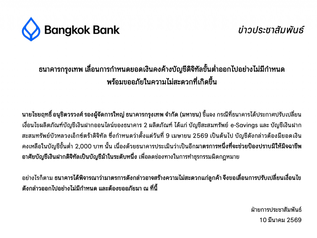 ประเด็นร้อนในโลกการเงินช่วง 24 ชั่วโมงที่ผ่านมา เมื่อ ธนาคารกรุงเทพ ประกาศปรับเงื่อนไขบัญชีเงินฝากดิจิทัล e-Savingsกำหนดให้ต้องมียอดเงินคงเหลือขั้นต่ำ 2,000 บาท เริ่ม 9 เม.ย. 2569 หากต่ำกว่าเกณฑ์จะไม่สามารถโอนหรือถอนเงินได้ ทำให้ลูกค้ารายย่อยจำนวนมากตั้งคำถามถึงความยืดหยุ่นของบัญชีออนไลน์ ก่อนที่ธนาคารจะออกแถลงการณ์ เลื่อนมาตรการออกไปอย่างไม่มีกำหนด พร้อมขออภัยต่อความไม่สะดวกที่เกิดขึ้น