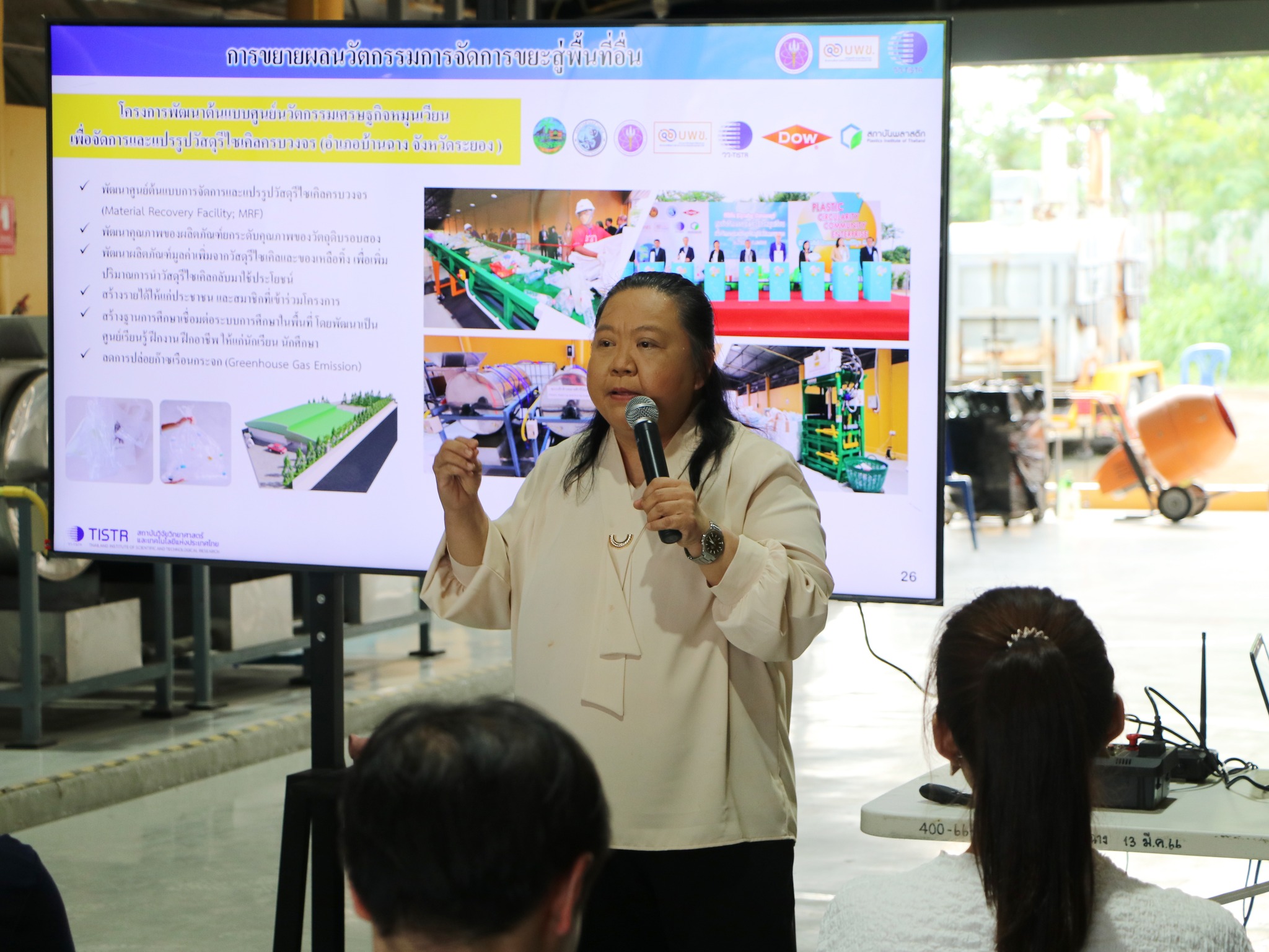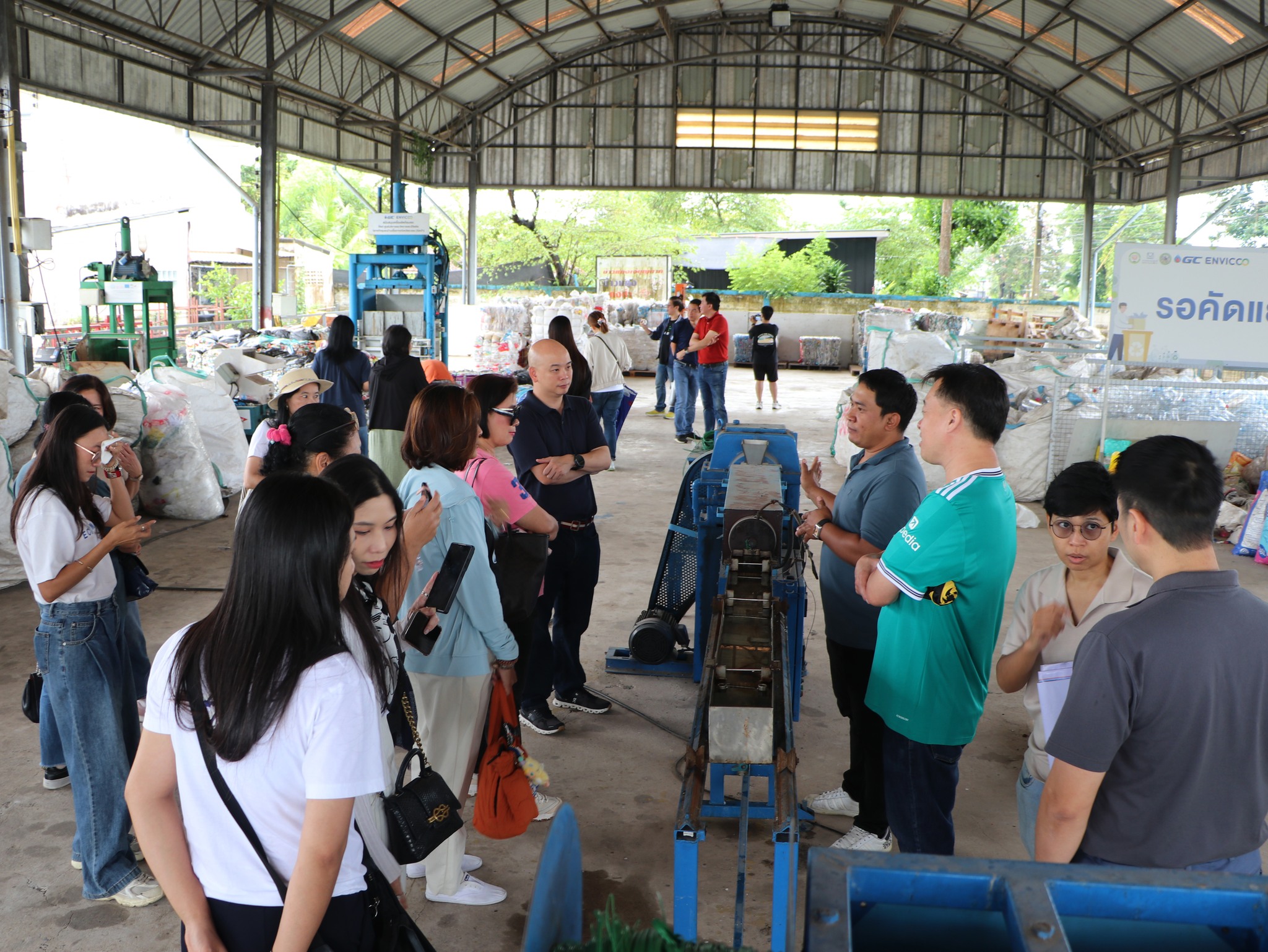 หลังจากนั้นเดินทางไปเยี่ยมชมศูนย์นวัตกรรมเศรษฐกิจหมุนเวียน เพื่อจัดการแปรรูปวัสดุรีไซเคิลครบวงจร (MRF) ซึ่งเป็นตัวกลางในการรับวัสดุพลาสติกนำมาคัดแยก และส่งต่อไปยังกระบวนการรีไซเคิล โดยนำองค์ความรู้ และเทคโนโลยี มาประยุกต์ใช้ในการส่งเสริมกระบวนการรีไซเคิลพลาสติก
