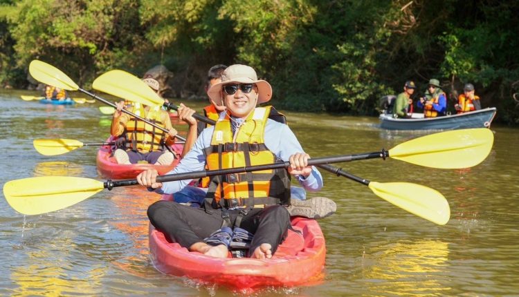 วันนี้เราจะล่องป่าสัก พายเรือแคนนู พายเรือคายัคกัน ก็ทั้งหมด 15 ลำ ระยะทาง 3 กิโลเมตร จากท่าที่วัดศรีวังม่วง ไปขึ้นที่ท่าสะบก สองฟากฝั่งจะสามารถสัมผัสทั้งป่าทั้งธรรมชาติสวยงาม เสน่ห์ของการพายเรือคายัคในครั้งนี้ นอกจากสองข้างทางที่สวยงามแล้ว เสน่ห์อีกจุดหนึ่งคือ ชมผาหมีเหนือ เสือใต้ Unseen แห่งใหม่ของสระบุรี ซึ่งเมื่อล่องลำน้ำไปได้สักระยะเราจะไปแวะที่จุดชมวิวที่ ผาหมีเหนือ เสือใต้ ตรงนั้นจะเป็นจุดไฮไลท์ซึ่งสวยงามมาก