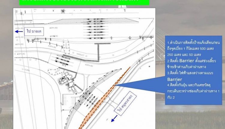 กทพ. แจ้งเบี่ยงการจราจรด่านฯ บางขุนเทียน 2 ทางออก 3 ช่องทางที่ 1 เพื่อดำเนินการซ่อมแซมหลังคาด่านเก็บค่าผ่านทางทางพิเศษ
