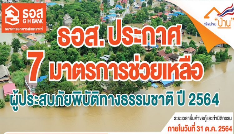 ทั้งนี้ ลูกค้าที่ประสงค์ขอรับบริการของ “โครงการเงินกู้ที่อยู่อาศัยเพื่อช่วยเหลือผู้ประสบภัยพิบัติธรรมชาติปี 2564” ตามมาตรการที่ 1-6 สามารถติดต่อได้ที่สาขาของ ธอส. ตั้งแต่บัดนี้เป็นต้นไปถึงวันที่ 31 ตุลาคม 2564 และมาตรการที่ 7 ติดต่อได้ที่สาขาของ ธอส. ตั้งแต่บัดนี้เป็นต้นไป สอบถามรายละเอียดเพิ่มเติมได้ที่ศูนย์ลูกค้าสัมพันธ์ (Call Center) โทร 0-2645-9000 หรือ Facebook Fanpage ธนาคารอาคารสงเคราะห์ หรือที่ ธอส. ทุกสาขาทั่วประเทศ และติดตามข้อมูลข่าวสารได้ที่ Application : GHB ALL และ www.ghbank.co.th