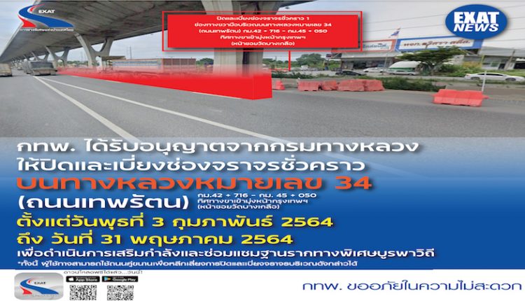 การทางพิเศษแห่งประเทศไทย (กทพ.) กระทรวงคมนาคมได้ว่าจ้างบริษัทซีวิล สเตทส์จำกัด ให้ดำเนินการเสริมกำลังและซ่อมแซมฐานรากทางพิเศษบูรพาวิถีจึงมีความจำเป็นต้องปิดและเบี่ยงช่องจราจรชั่วคราว ๑ ช่องทางด้านขวาสุดบนทางห ลวงหมายเลข 34 หรือถนนเทพรัตน บริเวณกม.42+716- กม.45 +050 ทิศทางขาเข้ามุ่งหน้ากรุงเทพฯ บริเวณหน้าซอยวัดบางเกลือ ตั้งแต่วันพุธที่ 3 กุมภาพันธ์ 2564 ถึง วันที่ 31 พฤษภาคม 2564 ในการนี้ กทพ.ได้รับอนุญาตจากกรมทางหลวงซึ่งเป็นผู้ดูแลทางหลวงหมายเลข 34 ให้เข้าดำเนินการปิดและเบี่ยงการจราจรได้ ผู้ใช้ทางสามารถใช้ถนนคู่ขนานเพื่อหลีกเลี่ยงการปิดและเบี่ยงจราจรบริเวณดังกล่าวได้