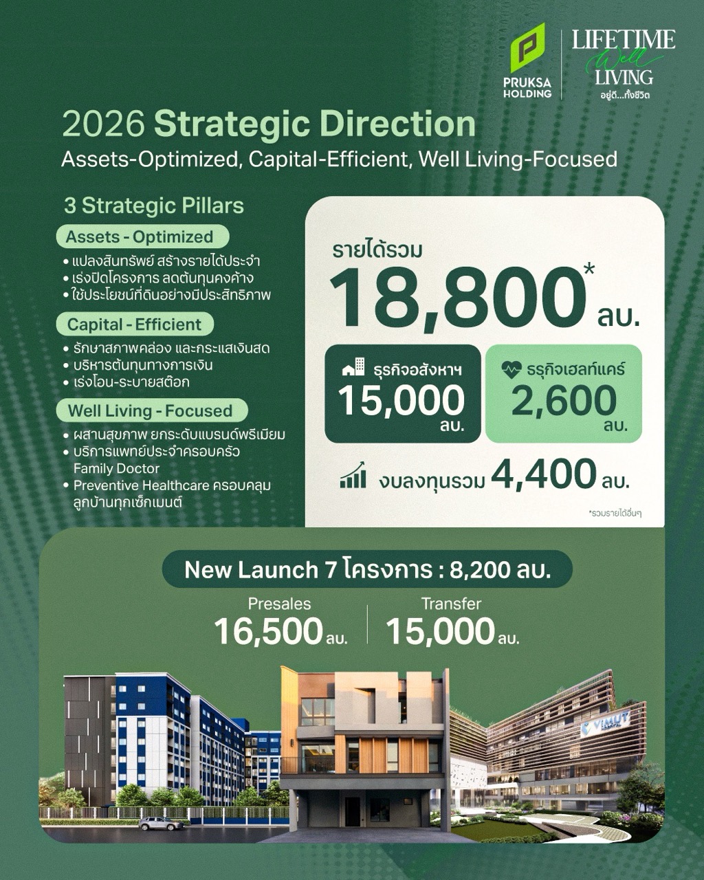พร้อมระบุถึงเป้าหมายปี 2569 ว่า “เราตั้งเป้ารายได้รวม 18,800 ล้านบาท แบ่งเป็นอสังหาริมทรัพย์ 15,000 ล้านบาท และเฮลท์แคร์ 2,600 ล้านบาท ภายใต้ 3 แกนหลัก Asset-Optimized, Capital-Efficient และ Well Living-Focused เพื่อยกระดับประสิทธิภาพการใช้สินทรัพย์ บริหารเงินทุนอย่างมีวินัย และสร้างความแตกต่างผ่านการเชื่อม ‘บ้าน’ กับ ‘การดูแลสุขภาพ’ อย่างครบวงจร”