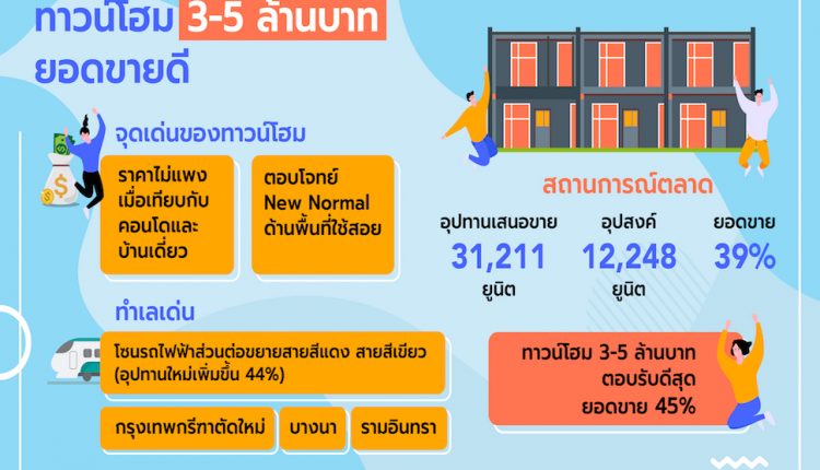 พลัส พร็อพเพอร์ตี้ สำรวจ ภาพรวมตลาดอสังหาฯ พบตลาดทาวน์โฮมเป็นกลุ่มที่น่าสนใจ ได้รับผลกระทบน้อย ตอบโจทย์เรียลดีมานด์ จากพฤติกรรมผู้ซื้อยุค New Normal ต้องการพื้นที่ในการอยู่อาศัยมากขึ้น ราคาไม่แพงเมื่อเทียบกับคอนโดฯ หรือบ้านเดี่ยว ขณะที่ระดับราคา 3-5 ล้านบาท ได้รับการตอบรับดีสุด โดยเฉพาะทำเลที่เข้าถึงรถไฟฟ้าใหม่ส่วนต่อขยาย ขณะที่โซนส่วนต่อขยายสายสีเขียว-แดง ยังคงมีการเปิดโครงการ คาดว่าจะมีความต้องการทาวน์โฮมเพิ่มมากขึ้นในบริเวณตอนเหนือของกรุงเทพฯ-ดอนเมือง, สายไหม, ปทุมธานี, ลำลูกกา ครอบคลุมไปถึงลาดหลุมแก้ว