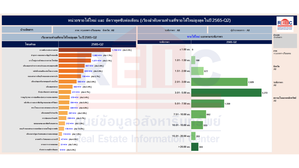 เมื่อแยกตามระดับราคาที่อยู่อาศัยพบว่ามีกลุ่มราคาที่อยู่อาศัยเปิดขายใหม่บางกลุ่มที่น่าจับตาและให้ความระมัดระวังเป็นพิเศษ คือกลุ่มดับราคา 1.01-1.50 ล้านบาท มีอัตราดูดซับลดลงอย่างมากโดยลดลงจากร้อยละ 13.6 ในไตรมาสแรก มาอยู่ที่ร้อยละ 8.3 ในไตรมาส 2 ปี 2565 และกลุ่มราคา > 20 ล้านบาท อัตราดูดซับลดลงจากร้อยละ 6.5 ในไตรมาสแรกมาอยู่ที่ร้อยละ 4.6 ในไตรมาส 2 ปี 2565 แสดงให้เห็นว่าการขายเริ่มมีทิศทางที่ชะลอตัวอย่างมีนัยสำคัญ