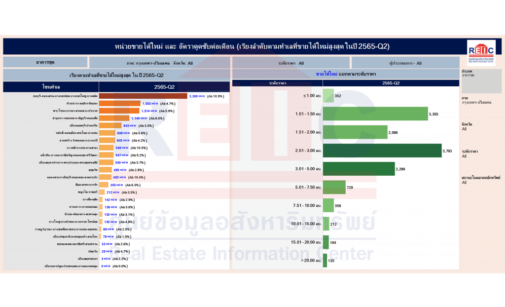 ส่วนทำเลที่มียอดขายสูงสุด 5 อันดับแรก ในส่วนของโครงการอาคารชุด อันดับ 1.โซนธนบุรี-คลองสาน-บางกอกน้อย-บางกอกใหญ่-บางพลัด จำนวนหน่วย 3,308 หน่วย มูลค่า 12,076 ล้านบาท อันดับ 2 โซนห้วยขวาง-จตุจักร-ดินแดง จำนวน 1,553 หน่วย มูลค่า 5,738 ล้านบาท อันดับ 3 พระโขนง-บางนา-สวนหลวง-ประเวศ จำนวน 1,514 หน่วย มูลค่า 4,515 ล้านบาท อันดับ 4. โซนลำลูกกา-คลองหลวง-ธัญบุรี-หนองเสือ จำนวน 1,140 หน่วย มูลค่า 2,092 ล้านบาท อันดับ 5 โซนเมืองนนทบุรี-ปากเกร็ด จำนวน 843 หน่วย มูลค่า 1,639 ล้านบาท