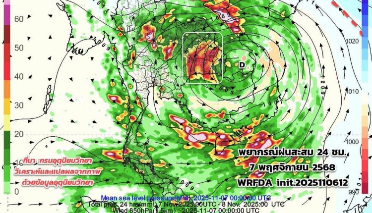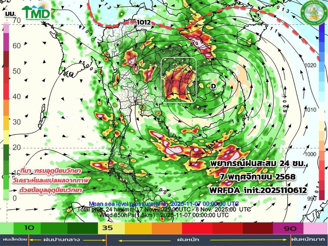 กรมอุตุนิยมวิทยา อัพเดทการพยากรณ์ฝนสะสมรายวัน 10 วันล่วงหน้า (7–16 พ.ย. 68) จากแบบจำลองของกรมอุตุนิยมวิทยา (TMD-WRFDA) พายุคัลแมกี อ่อนกำลังลงเป็นพายุโซนร้อนแล้วเช้าวันนี้ (7 พ.ย. 68) ศูนย์กลางอยู่บริเวณชายแดนลาว–กัมพูชา คาดว่าจะอ่อนกำลังลงเป็น “พายุดีเปรสชัน” เคลื่อนตัวทางตะวันตกเฉียงเหนือเข้าสู่พื้นที่จังหวัดอุบลราชธานี ก่อนจะสลายตัวเป็น “หย่อมความกดอากาศต่ำ” ปกคลุมไทยตอนบน