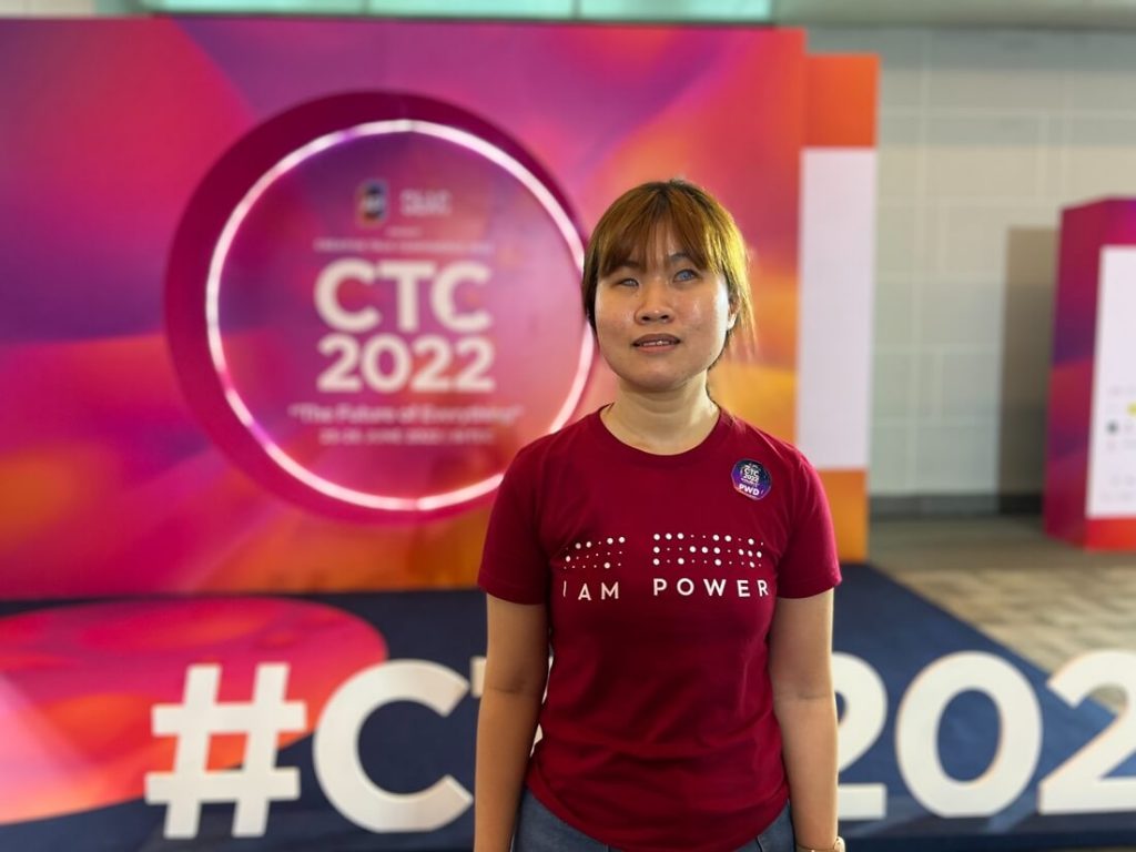 นางสาวกมลวรรณ กระถินทอง ผู้พิการทางการเคลื่อนไหว เปิดเผยว่า “ผู้พิการแต่ละคนมีต้นทุนทางชีวิตไม่เท่ากัน แต่มีโอกาสในการเรียนรู้ได้เหมือนกัน อย่างเช่นงาน CTC 2022 ครั้งนี้ ได้จุดประกายและกระตุ้นพลังบวกในตัวเอง ให้ไม่หยุดที่จะเรียนรู้ และพร้อมที่จะก้าวเดินต่อไปอย่างมีความสุข ที่ผ่านมาตนเองเมื่อจบการศึกษาได้สมัครงานไปหลายแห่ง พอถึงขั้นตอนการไปสัมภาษณ์ พบว่าเรานั่งวีลแชร์ บางแห่งก็ปฏิเสธทันทีโดยไม่ได้เปิดโอกาสในการพูดคุยใดๆ อย่างไรก็ตาม ปัจจุบันองค์กรใหญ่ๆ หลายแห่งเปิดกว้าง และรับผู้พิการเข้าทำงาน ให้ได้สานฝันทำงานที่เรารัก สำหรับตนเองมองว่าในอนาคตนอกเหนือจากการทำงานที่ตรงกับวิชาชีพแล้ว ยังอยากที่จะทำงานด้านสังคมเพื่อสร้างประโยชน์ให้กับเพื่อนๆ ผู้พิการด้วยเช่นกัน”