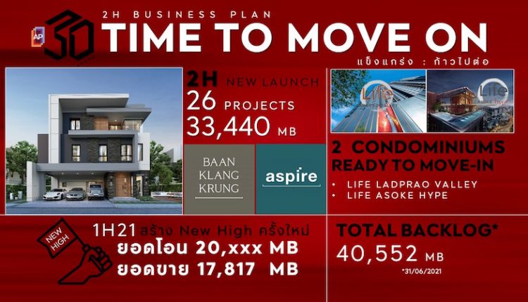 สำหรับแผนครึ่งปีหลังบริษัทฯ เตรียมรุกเปิดตัวโครงการใหม่ทั้งสิ้น 26 โครงการ มูลค่ารวม 33,440 ล้านบาทเป็นโครงการแนวราบจำนวน 22โครงการ มูลค่าประมาณ 20,440ล้านบาท และคอนโดมิเนียม4โครงการ มูลค่าประมาณ 13,000ล้านบาท และแผนการโอนกรรมสิทธิ์ 2คอนโดใหม่ LIFE ลาดพร้าว แวลลีย์ และ LIFE อโศก ไฮป์มูลค่ารวม 12,300ล้านบาท ซึ่ง ณ วันที่ 30 มิถุนายน 64บริษัทฯ มียอดขายรอโอน (Backlog)เพื่อรองรับการเติบโตระยะยาวในอีก 3ปี มากถึง 40,552 ล้านบาท