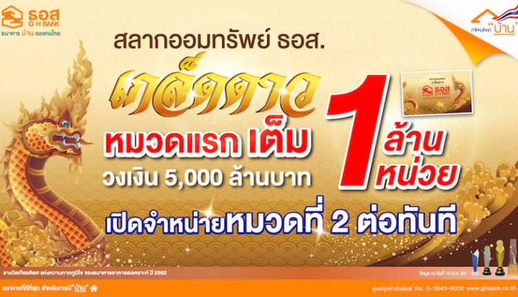 ขายหมดแล้วชุดแรก 5 พันล้าน “สลากออมทรัพย์ ธอส. ชุดเกล็ดดาว” จำนวน 1 ล้านหน่วย ผู้ซื้อลุ้นรางวัลสูงสุด 1 ล้านบาท นาน 24 เดือน หลังเปิดจำหน่ายเพียง 7 วัน (20-27 ตุลาคม 2563X พร้อมเปิดขาย หมวดที่ 2 ต่อทันที วงเงิน 5,000 ล้านาท 1 ล้านหน่วย หาซื้อผ่าน Application : GHB ALL หรือที่ทำการสาขาทั่วประเทศ เตรียมนำเงินจากการจำหน่ายสลากออก“โครงการสินเชื่อบ้าน Two-Gen” ทางเลือก ประชาชนซื้อแบ่งเบาภาระ ผ่อนชำระรายเดือน กู้ระยะยาวสูงสุด 70 ปี