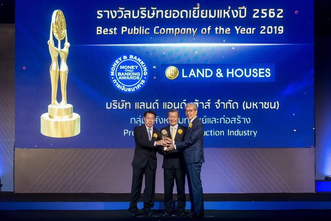 คุณอดิศร ธนนันท์นราพูล กรรมการผู้จัดการ บ. แลนด์ แอนด์ เฮ้าส์ จำกัด (มหาชน) เป็นผู้แทนบริษัทฯ รับรางวัลเกียรติยศ บริษัทยอดเยี่ยมแห่งปี 2562 กลุ่มอสังหาริมทรัพย์และก่อสร้าง จากดร.สมคิด จาตุศรีพิทักษ์ รองนายกรัฐมนตรี ซึ่งให้เกียรติเป็นประธานมอบรางวัลในงาน MONEY & BANKING AWARDS 2019 จัดขึ้นโดยวารสารการเงินธนาคาร โดยมี คุณสันติ วิริยะรังสฤษฎ์ (กลาง) ประธานบรรณาธิการ วารสารการเงินธนาคาร ร่วมในพิธีมอบรางวัล โดยรางวัลบริษัทยอดเยี่ยมแห่งปีนั้นพิจารณาจากผลประกอบการในปี 2561 ของบริษัทจดทะเบียนใน แต่ละกลุ่มอุตสาหกรรม