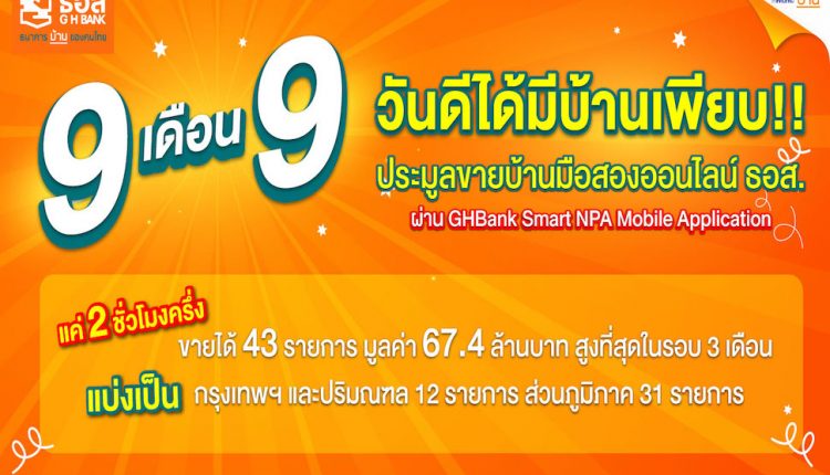 แห่ประมูลซื้อทรัพย์ NPA ธอส. 2 ชั่วโมงครึ่งขายได้ถึง 43 รายการ มูลค่ารวม 67.4 ล้านบาท“9 เดือน 9” วันดี ได้มีบ้านเพียบ ออนไลน์