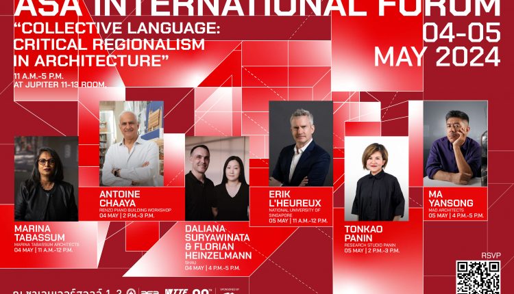 โดยปีนี้ทางสมาคมสถาปนิกสยามฯ ได้เชิญวิทยากรที่มีชื่อเสียงระดับโลก อาทิ อองตวน ชายา (Antoine Chaaya) พาร์ทเนอร์คนสำคัญของ เรนโซ่ เปียโน จาก Renzo Piano Building Workshop (RPBW), หม่าเหยียนซง (Ma Yansong) สถาปนิกจีนชื่อดังจาก MAD Architects, มาริน่า ทาบาสซัม(Marina Tabassum) สถาปนิกบังคลาเทศเจ้าของรางวัล Aga Khan ร่วมด้วยสองสถาปนิกผู้ก่อตั้ง SHAU จากอินโดนีเซีย ดาเลียนา และ ฟลอเรียน (Daliana Suryawinata and Florian Heinzelmann), เอริค เลอรูซ์ (Erik L’Heureux) รองศาสตราจารย์และคณบดีมหาวิทยาลัยแห่งชาติสิงคโปร์ (NUS) และคุณต้นข้าว ปาณินท์ ศาสตราจารย์ ประจำมหาวิทยาลัยศิลปากรและสถาปนิกไทยผู้ก่อตั้ง Research Studio Panin มาร่วมแบ่งปันประสบการณ์ในงานสถาปนิก’67 ผ่านเวที ASA International Forum ซึ่งจะจัดขึ้นในวันที่ 4 – 5 พฤษภาคม 2567 ณ ห้องจูปิเตอร์ 11-13 อาคารชาเลนเจอร์ อิมแพ็ค เมืองทองธานี สำหรับผู้สนใจสามารถศึกษารายละเอียดเพิ่มเติมหรือติดต่อลงทะเบียนร่วมงานเสวนา ฟรี ไม่มีค่าใช้จ่าย ได้ที่ https://www.asaexpo.org/forum2024