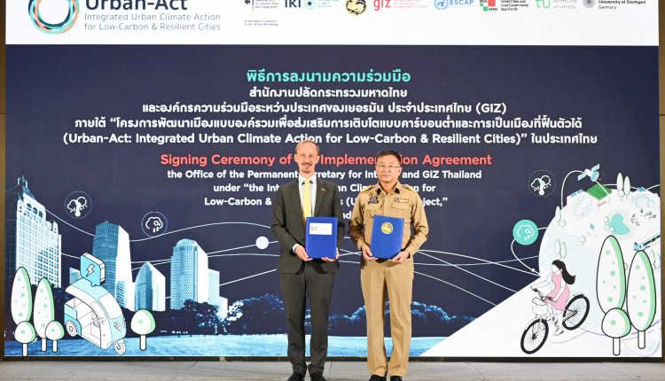 กระทรวงมหาดไทยลงนามความร่วมมือกับองค์กรความร่วมมือระหว่างประเทศของเยอรมัน (GIZ) เพื่อร่วมผลักดัน “โครงการพัฒนาเมืองแบบองค์รวมเพื่อส่งเสริมการเติบโตแบบคาร์บอนต่ำและการเป็นเมืองที่ฟื้นตัวได้ (Urban-Act: Integrated Urban Climate Action for Low-Carbon & Resilient Cities)” ในประเทศไทย