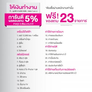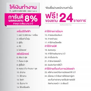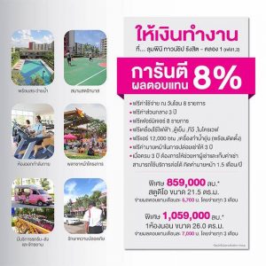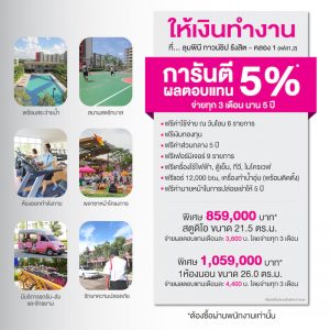 ทั้งนี้ ลูกค้าจะได้รับผลตอบแทนคงที่แน่นอนทุกเดือน โดยจ่ายทุก 3 เดือน มีผลตอบแทนการันตีให้เลือก 2 แบบ คือ แบบการันตีผลตอบแทน 8% นาน 3 ปี รับผลตอบแทนเดือนละ 7,000 บาท กับขนาด 1 ห้องนอน พื้นที่ 26 ตร.ม. ราคาพิเศษ 1,059,000 บาท หรือรับผลตอบแทนเดือนละ 5,700 บาท จากห้องสตูดิโอ ขนาด 21.50 ตร.ม. ราคาพิเศษที่ 859,000 บาท นอกจากนี้ ยังได้รับ ฟรี! ของแถม 24 รายการ อาทิ เฟอร์นิเจอร์ เครื่องไฟฟ้าต่างๆ และอื่นๆ และแบบการันตีผลตอบแทน 5% นาน 5 ปี รับผลตอบแทนเดือนละ 4,400 บาท กับขนาด 1 ห้องนอน พื้นที่ 26 ตร.ม. ราคาพิเศษ 1,059,000 บาท หรือรับผลตอบแทนเดือนละ 3,600 บาท จากห้องสตูดิโอ ขนาด 21.50 ตร.ม. ราคาพิเศษที่ 859,000บาท นอกจากนี้ ยังได้รับ ฟรี! ของแถม 23 รายการ อาทิ เฟอร์นิเจอร์ เครื่องไฟฟ้าต่างๆ และอื่นๆ โดยผู้ลงทุนจะได้รับผลตอบแทนทุก 3 เดือน และเมื่อครบกำหนด 3 ปีหรือ 5 ปี แล้ว หากต้องการให้บริษัทช่วยจัดหาผู้เช่าและบริหารงานเช่าให้ก็สามารถขอบริการต่อได้โดยมีค่าบริการ 1.5 เดือน/ปี
