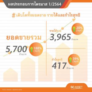 ทั้งนี้เนื่องจากบ้าน SC ขายดีและเติบโตทุกราคา ใน 3 กลุ่มหลัก คือ บ้านราคามากกว่า 20 ล้านบาท ซึ่งเป็นพอร์ตหลักและแข็งแกร่ง เติบโตประมาณ 4 เท่า หรือเติบโต268% YoY, บ้านราคา 5-20 ลบ. มีการเติบโตประมาณ 2 เท่า หรือเติบโต113% YoYและบ้านราคาน้อยกว่า 5 ล้านบาท เติบโต 10%YoY