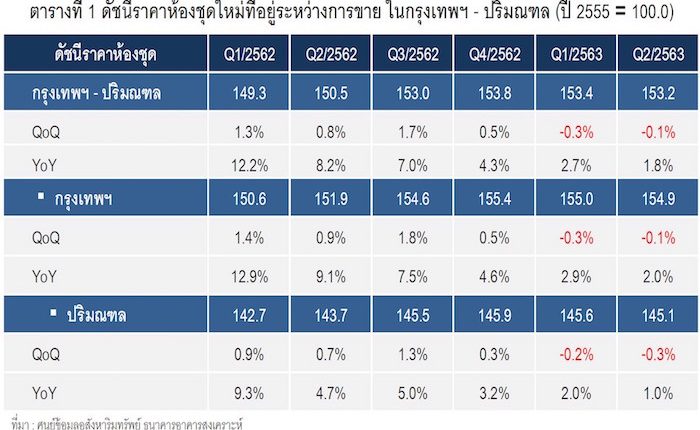 ดร.วิชัย วิรัตกพันธ์ ผู้ตรวจการธนาคารอาคารสงเคราะห์ และรักษาการผู้อำนวยการศูนย์ข้อมูลอสังหาริมทรัพย์ เปิดเผยว่า ศูนย์ข้อมูลอสังหาริมทรัพย์ ธนาคารอาคารสงเคราะห์ดัชนีราคาที่ดินเปล่าก่อนการพัฒนาในกรุงเทพฯ-ปริมณฑล ในไตรมาส 2 ปี 2563 มีค่าดัชนีเท่ากับ 308.6 เพิ่มขึ้นร้อยละ 5.2 เมื่อเทียบกับไตรมาสก่อนหน้า (QoQ) ซึ่งมีค่าดัชนีเท่ากับ 293.3 และปรับเพิ่มขึ้นร้อยละ 30.3 เมื่อเทียบกับช่วงเวลาเดียวกันของปีก่อน (YoY)ซึ่งมีค่าดัชนีเท่ากับ 236.9 จุด