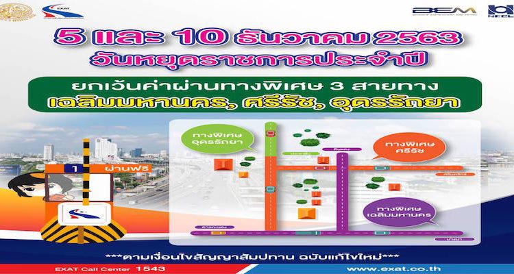 การทางพิเศษแห่งประเทศไทย (กทพ.) กระทรวงคมนาคม ยกเว้นค่าผ่านทางพิเศษของทางพิเศษเฉลิมมหานคร ทางพิเศษศรีรัช และทางพิเศษอุดรรัถยา3 สายทาง ในวันเสาร์ที่ 5 ธันวาคม 2563 (วันคล้ายวันพระราชสมภพของพระบาทสมเด็จพระบรมชนกาธิเบศร มหาภูมิพลอดุลยเดชมหาราชบรมนาถบพิตร วันชาติ และวันพ่อแห่งชาติ) และวันพฤหัสบดีที่10 ธันวาคม 2563 (วันรัฐธรรมนูญ) ตั้งแต่เวลา00.01 น. ถึง 24.00 น. ซึ่งเป็นวันหยุดราชการประจำปีตามประกาศสำนักนายกรัฐมนตรีที่ กทพ. บริษัท ทางด่วนและรถไฟฟ้ากรุงเทพ จำกัด (มหาชน) (BEM) และบริษัท ทางด่วนกรุงเทพเหนือ จำกัด (NECL) ร่วมปฏิบัติตามเงื่อนไขสัญญาสัมปทานโครงการระบบทางด่วนขั้นที่2 (ทางพิเศษศรีรัชรวมถึงส่วน D) และสัญญาโครงการทางด่วนสายบางปะอิน-ปากเกร็ด (ทางพิเศษอุดรรัถยา) ฉบับแก้ไขใหม่ เพื่อเป็นการอำนวยความสะดวกในการเดินทางของประชาชนในวันหยุด และช่วยลดภาระค่าใช้จ่ายให้แก่ประชาชนรวมทั้งช่วยลดปัญหาจราจรติดขัดบริเวณหน้าด่านเก็บค่าผ่านทางพิเศษได้อีกด้วย