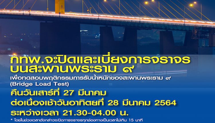 การทางพิเศษแห่งประเทศไทย (กทพ.) กระทรวงคมนาคมได้ว่าจ้างบริษัท ไอเอ็มเอ็มเอส จำกัด ให้ดำเนินการทดสอบพฤติกรรมการรับน้ำหนักของสะพานพระราม 9 (Bridge Load Test) และจัดทำระบบตรวจสอบและเฝ้าติดตามพฤติกรรมของโครงสร้างสะพานพระราม 9 (เครื่องจักรอุปกรณ์) จึงมีความจำเป็นต้องปิดและเบี่ยงช่องทางการจราจรชั่วคราวในคืนวันเสาร์ที่ 27 มีนาคมต่อเนื่องเช้าวันอาทิตย์ที่ 28 มีนาคม 2564 ระหว่างเวลา 21.30-04.00 น. โดยในช่วงเวลาดังกล่าวจะมีการปิดจราจรทุกช่องทางเป็นเวลาไม่เกิน 15 นาที