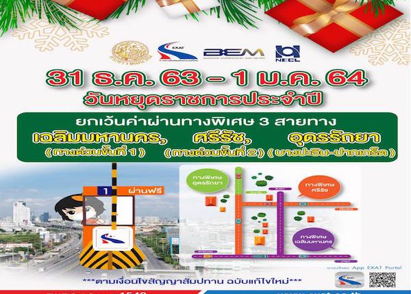 การทางพิเศษแห่งประเทศไทย (กทพ.) กระทรวงคมนาคม มอบของขวัญปีใหม่ให้แก่ผู้ใช้ทางพิเศษตลอดจนประชาชนทั่วไป เพื่ออำนวยความสะดวกและช่วยลดภาระค่าใช้จ่ายของประชาชน ในช่วงเทศกาลปีใหม่ โดยยกเว้นค่าผ่านทางพิเศษ จำนวน 5 สายทาง ประกอบด้วยทางพิเศษบูรพาวิถีหรือทางด่วนสายบางนา-ชลบุรี กับทางพิเศษกาญจนาภิเษกหรือทางด่วนสายบางพลี-สุขสวัสดิ์ ระหว่างวันที่ 30 ธันวาคม 2563 จนถึงวันที่ 4 มกราคม2564 รวมทั้งสิ้น 6 วัน รวมถึงร่วมกับ บริษัท ทางด่วนและรถไฟฟ้ากรุงเทพ จำกัด (มหาชน) และบริษัท ทางด่วนกรุงเทพเหนือ จำกัด ยกเว้นค่าผ่านทางของทางพิเศษเฉลิมมหานคร หรือทางด่วนขั้นที่ 1 ทางพิเศษศรีรัชหรือทางด่วนขั้นที่ 2 และทางพิเศษอุดรรัถยา หรือทางด่วนสายบางปะอิน-ปากเกร็ด ในวันที่ 31 ธันวาคม 2563และวันที่ 1 มกราคม 2564 จำนวน 2 วัน