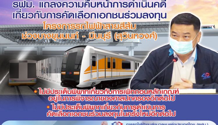 นายภคพงศ์ ศิริกันทรมาศ ผู้ว่าการการรถไฟฟ้าขนส่งมวล ชนแห่งประเทศไทย (รฟม.) เปิดเผยว่า กรณีแถลงคืบหน้าการดำเนินคดีเกี่ยวกับการคัดเลือกเอกชนร่วมลงทุนโครง การรถไฟฟ้าสายสีส้ม ช่วงบางขุนนนท์-มีนบุรี (สุวินทวงศ์) ในคดีหมายเลขดำที่ 580/2564 ศาลปกครองสูงสุดได้มีคำสั่งยืนตามคำสั่งศาลปกครองชั้นต้นที่มีคำสั่งไม่รับคำฟ้องของผู้ฟ้องคดีในข้อหาที่ผู้ฟ้องคดี อ้างว่าการกระทำของคณะกรรมการคัดเลือกตามมาตรา 36 และ รฟม. เป็นการกระทำละเมิดต่อผู้ฟ้องคดี และที่ผู้ฟ้องคดีมีคำขอห้ามมิให้คณะกรรมการคัดเลือกตามมาตรา 36 และ รฟม. กระทำการหรือดำเนินการใด ๆ ที่เกี่ยวข้องกับการคัดเลือกเอกชนในโครงการพิพาทครั้งใหม่ โดยมีเหตุผลว่า การดำเนินการคัดเลือกเอกชนเป็นอำนาจหน้าที่ของฝ่ายปกครองตามพระราชบัญญัติการร่วมลงทุนระหว่างรัฐและเอกชน พ.ศ. 2562 ศาลปกครองไม่อาจมีคำสั่งกำหนดคำบังคับตามมาตรา 72 วรรคหนึ่ง (3) แห่งพระราชบัญญัติจัดตั้งศาลปกครองและวิธีพิจารณาคดีปกครอง พ.ศ. 2542 ให้คณะกรรมการคัดเลือกตามมาตรา 36 และ รฟม. กระทำการหรืองดเว้นกระทำการที่ยังไม่ได้เกิดขึ้นได้
