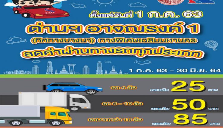 ลดค่าผ่านทางพิเศษด่านฯ อาจณรงค์ 1 (บางนา) ตั้งแต่ 1 กรกฎาคม 2563 ถึง 30 มิถุนายน 2564 สำหรับรถทุกประเภท