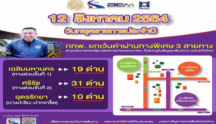 กระทรวงคมนาคม ยกเว้นค่าผ่านทางพิเศษของทางพิเศษ รวม 3 สายทาง ดังนี้ ทางพิเศษเฉลิมมหานคร (ทางด่วนขั้นที่ 1) จำนวน 19 ด่าน ทางพิเศษศรีรัช (ทางด่วนขั้นที่ 2) จำนวน 31 ด่าน และทางพิเศษอุดรรัถยา (บางปะอิน-ปากเกร็ด) จำนวน 10 ด่าน ในวันพฤหัสบดีที่ 12 สิงหาคม 2564 (วันเฉลิมพระชนมพรรษา สมเด็จพระนางเจ้าสิริกิติ์ พระบรมราชินีนาถ พระบรมราชชนนีพันปีหลวง หรือ วันแม่แห่งชาติ) ตั้งแต่เวลา 00.01 น. ถึง 24.00 น. จำนวน 1 วัน ซึ่งเป็นวันหยุดราชการประจำปีตามประกาศสำนักนายกรัฐมนตรี โดยเป็นไปตามนโยบายของรัฐบาลและกระทรวงคมนาคมที่ปรากฏในสัญญาสัมปทาน ฉบับแก้ไขใหม่ระหว่าง กทพ. บริษัท ทางด่วนและรถไฟฟ้ากรุงเทพ จำกัด (มหาชน) (BEM) และบริษัท ทางด่วนกรุงเทพเหนือ จำกัด (NECL) เพื่อช่วยลดภาระค่าใช้จ่ายให้แก่ประชาชน
