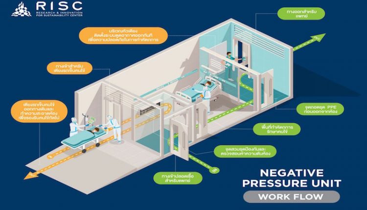 “ห้องฉุกเฉินความดับลบ (Negative Pressure ER) 100% Fresh Air” ได้มีการพัฒนาโดย RISC by MQDC ร่วมกับ EEC ออกแบบห้องฉุกเฉินความดันลบ 12 Pa (*ข้อกำหนดขั้นต่ำของห้องความดันลบ 7.5 Pa) ทางเข้าของแพทย์ (Anteroom) เตรียมความดันลบที่ 5 Pa เพื่อทำให้อากาศภายในห้องที่มีผู้ป่วยติดเชื้ออยู่ไม่ไหลออกสู่ภายนอก ป้องกันการแพร่กระจายเชื้อ ภายในห้องได้มีการออกแบบแยกพื้นที่ให้มีความดันลบต่างกัน แยกทางเข้า-ออก เป็นทางเดียว (one-way route) เพื่อลดทั้งโอกาสการติดเชื้อ และลดการแพร่เชื้อสู่ส่วนต่างๆ ของห้อง