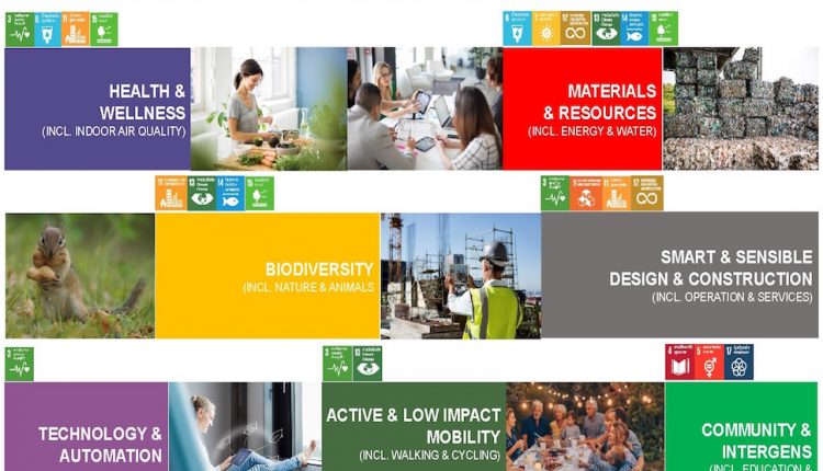 6.การลดผลกระทบจากการเดินทาง(Active & Low impact Mobility) สอดคล้องกับหลักการของสหประชาชาติในเรื่องของ Good Health and well-being และ Climate Action โดยการออกแบบเพื่อลดการใช้รถยนต์ ลดการตัดถนน ส่งเสริมพฤติกรรมการเดิน ซึ่งจะช่วยลดมลภาวะจากการใช้รถยนต์ลงได้ อย่างโครงการ101 True Digital Park ได้มีการสร้างสกาย วอล์ค เชื่อมต่อเข้าสู่โครงการ และยังมีการออกแบบพื้นที่ส่วนกลางที่ส่งเสริมการเดิน การใช้จักรยาน หรือแม้แต่มีการติดตั้งสถานีชาร์จไฟฟ้า (EV Charger) รวมถึงโครงการ THE FORESTIAS ที่จะมีการออกแบบพื้นที่ปิดชัดเจน รถยนต์ไม่สามารถเข้าถึงได้ ออกแบบสร้างพื้นที่การเรียนรู้ และพักผ่อนหย่อนใจที่มีความร่มรื่น ส่งเสริมให้เกิดการเดินและใช้ชีวิตภายนอกอาคารมากขึ้น