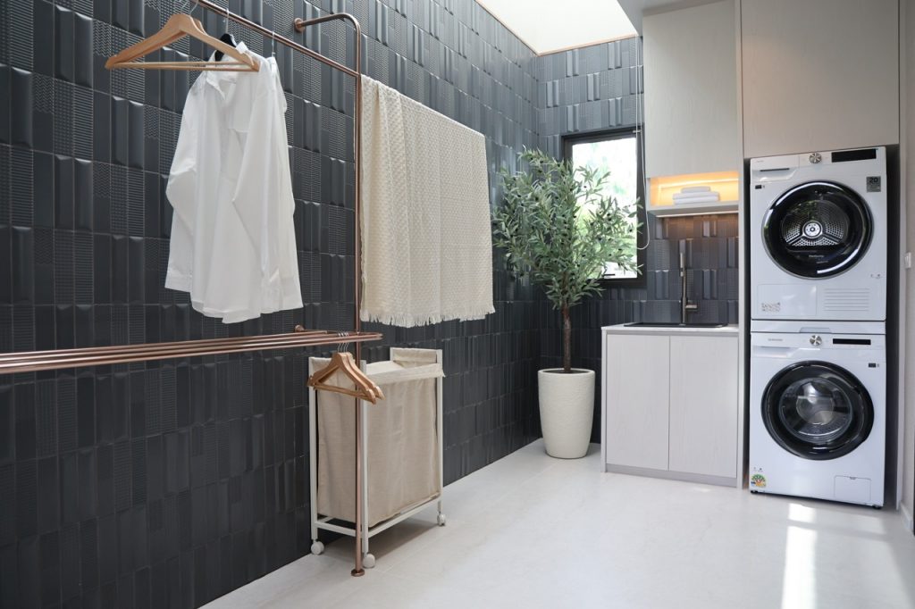 จุดขายหลักของ GUTÉ คือการรีเฟรชแนวคิดออกแบบใหม่ทั้งแบรนด์ ไม่ใช่เพียงปรับฟังก์ชันแบบบ้าน โดยนำสถาปัตยกรรมเส้นสายโค้งมน ลื่นไหล โทนสีขาว–ครีม–น้ำตาลอ่อน ผสาน Grand Ceiling สูงสุด 8 เมตร และห้องซัก-ตาก-รีดแบบ Glasshouse เป็นมาตรฐานในหลายแบบบ้าน สร้างภาพจำต่างจากบ้านลักชัวรีทั่วไปที่เน้นโมเดิร์นสี่เหลี่ยมเรียบตรง