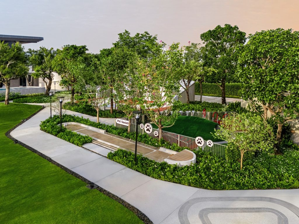 แนวคิด “Miniature Nature” จัดภูมิทัศน์เสมือนย่อส่วนธรรมชาติ สร้างพื้นที่สีเขียวทดแทนบริบทชุมชนหนาแน่น พร้อมสิ่งอำนวยความสะดวกครบวงจร ได้แก่ สระว่ายน้ำระบบเกลือ ฟิตเนส ห้องโยคะ/พิลาทิส สนามบาสเก็ตบอล Jogging Track และ PET Society
