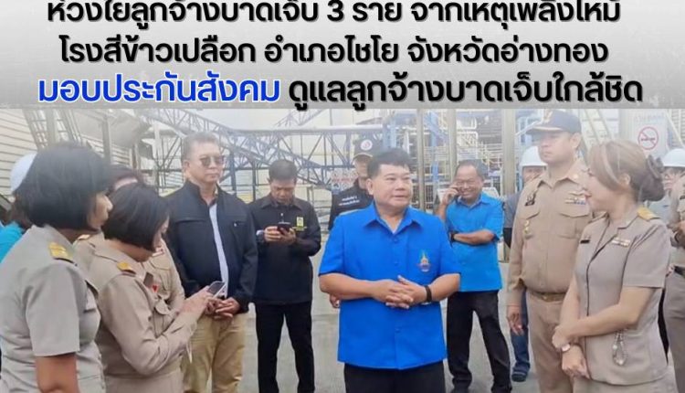 จากเหตุการณ์เพลิงไหม้โรงสีในพื้นที่อำเภอไชโย จังหวัดอ่างทอง เมื่อวันที่ 16 พฤศจิกายน 2568 เป็นเหตุให้ลูกจ้างได้รับบาดเจ็บจำนวน 3 ราย ล่าสุด นางสาวตรีนุช เทียนทอง รัฐมนตรีว่าการกระทรวงแรงงาน มีความห่วงใยสั่งการสำนักงานประกันสังคมเร่งให้ความช่วยเหลือทันที ในการนี้ นางสาวกาญจนา พูลแก้ว ผู้ตรวจราชการกระทรวงแรงงาน รักษาราชการแทนเลขาธิการสำนักงานประกันสังคม ได้มอบหมายให้ นางสาวปารินทร์ วิไลโรจน์ ประกันสังคมจังหวัดอ่างทอง ลงพื้นที่ตรวจสอบสถานการณ์และเยี่ยมให้กำลังใจผู้ได้รับบาดเจ็บและญาติอย่างใกล้ชิด ณ โรงพยาบาลอ่างทองและโรงพยาบาลไชโย เพื่อประสานความช่วยเหลืออย่างเต็มกำลัง และ สร้างความมั่นใจให้แก่ลูกจ้างและครอบครัว
